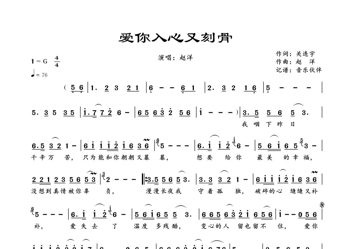 《爱你入心又刻骨》是赵洋演唱的一首歌曲,拍号为4/4拍,歌曲速度为每分钟76拍,这份简谱共有一张高清图谱,图谱由 @音乐伙伴 编配上传。