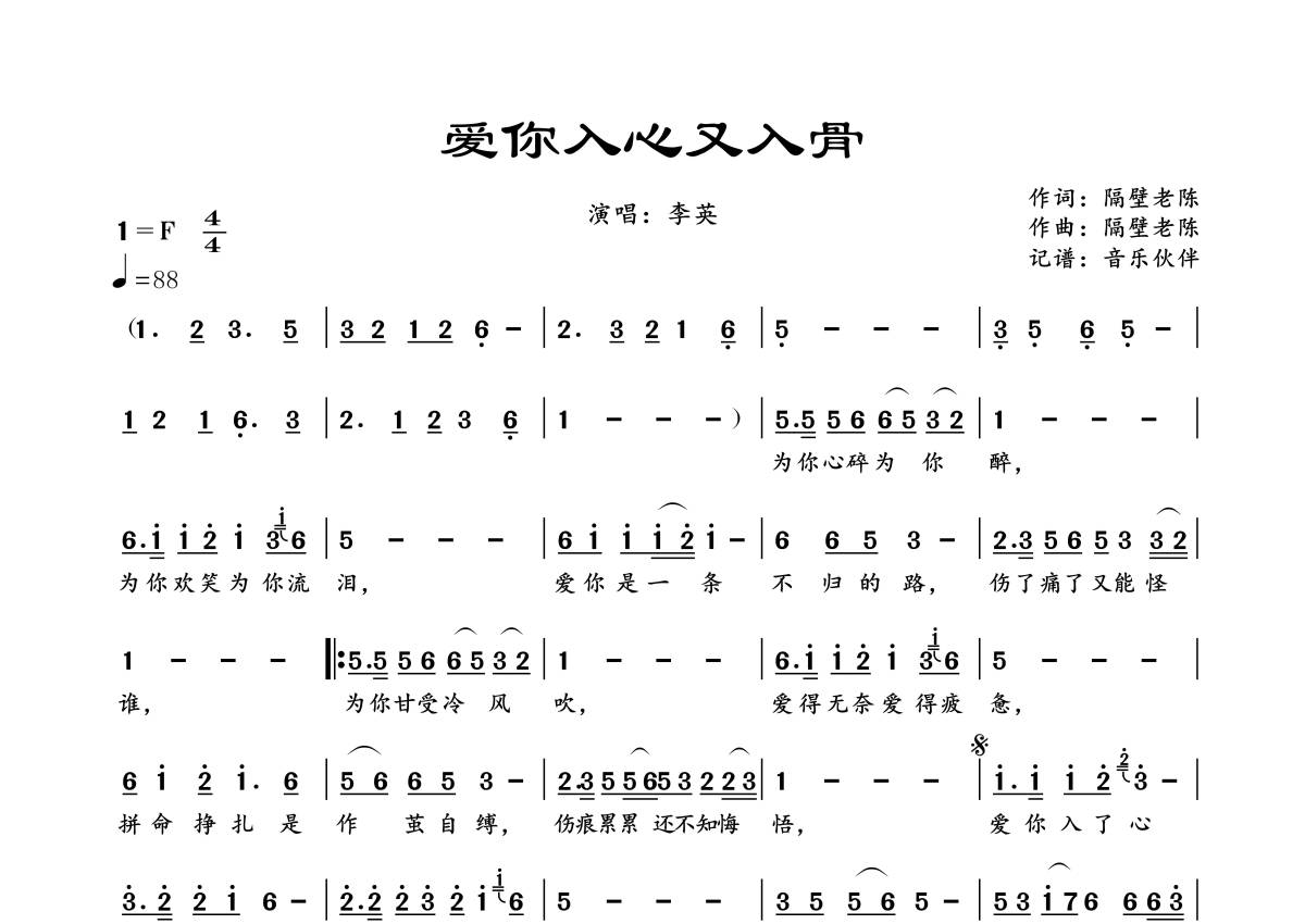 《爱你入心又入骨》是李英演唱的一首歌曲,拍号为4/4拍,歌曲速度为每分钟88拍,这份简谱共有一张高清图谱,图谱由 @音乐伙伴 编配上传。