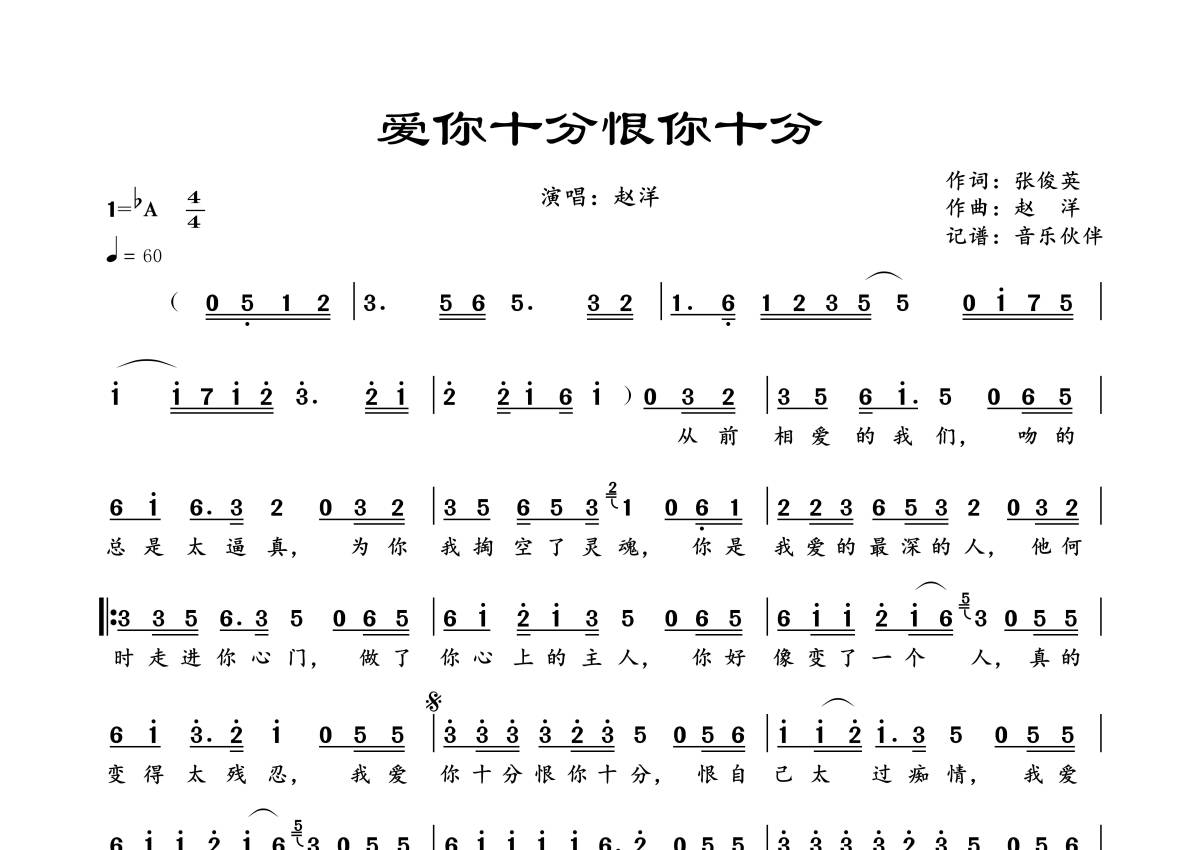 《爱你十分恨你十分》是赵洋演唱的一首歌曲,拍号为4/4拍,歌曲速度为每分钟60拍,这份简谱共有一张高清图谱,图谱由 @音乐伙伴 编配上传。