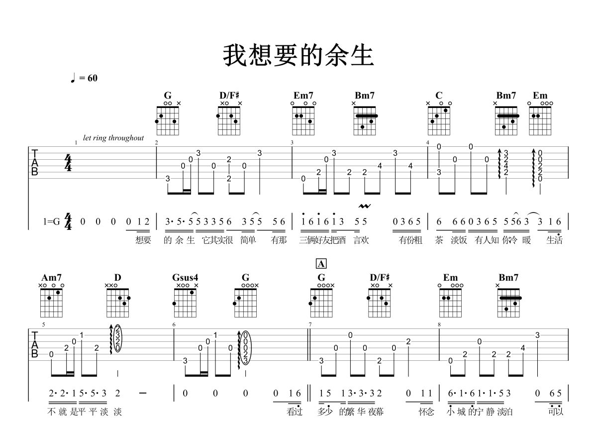 王一一《我想要的余生》吉他谱 - G调弹唱六线谱 - 石头音乐原版记谱