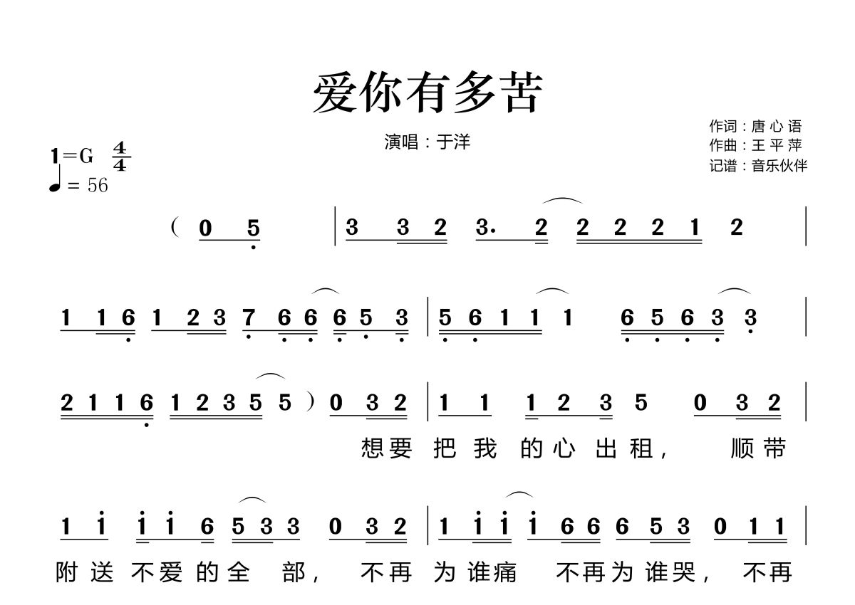 《爱你有多苦》是于洋演唱的一首歌曲,这份简谱共有两张高清图谱,图谱由 @音乐伙伴 编配上传。
