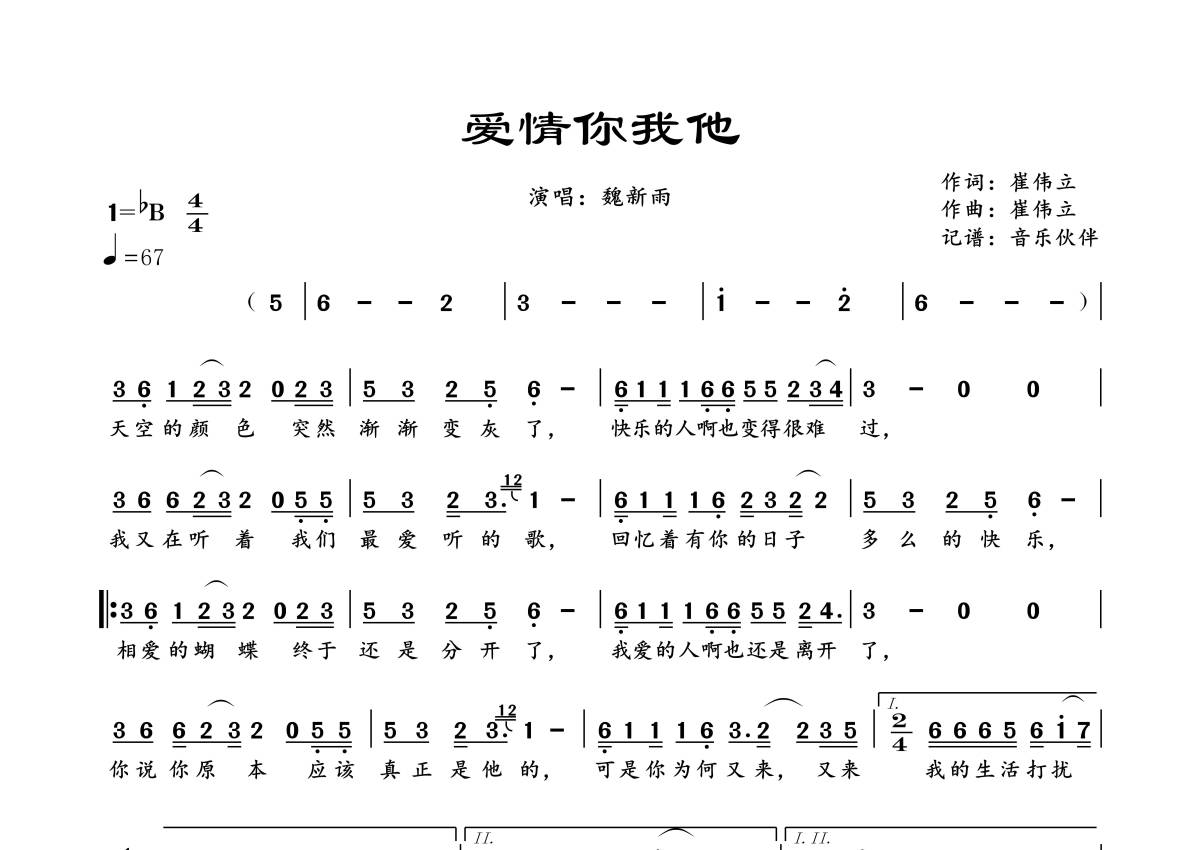 《爱情你我他》是魏新雨演唱的一首歌曲,拍号为4/4拍,歌曲速度为每分钟67拍,这份简谱共有一张高清图谱,图谱由 @音乐伙伴 编配上传。