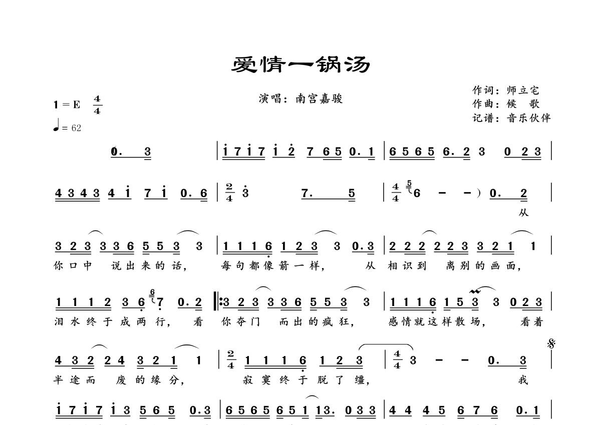 《爱情一锅汤》是南宫嘉骏演唱的一首歌曲,拍号为4/4拍,歌曲速度为每分钟62拍,这份简谱共有一张高清图谱,图谱由 @音乐伙伴 编配上传。
