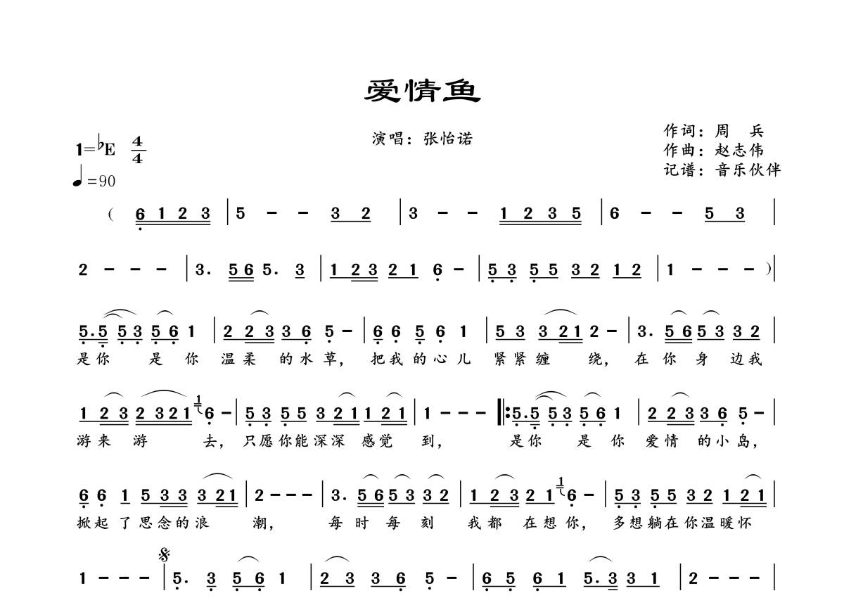 《爱情鱼》是张怡诺演唱的一首歌曲,拍号为4/4拍,歌曲速度为每分钟90拍,这份简谱共有一张高清图谱,图谱由 @音乐伙伴 编配上传。
