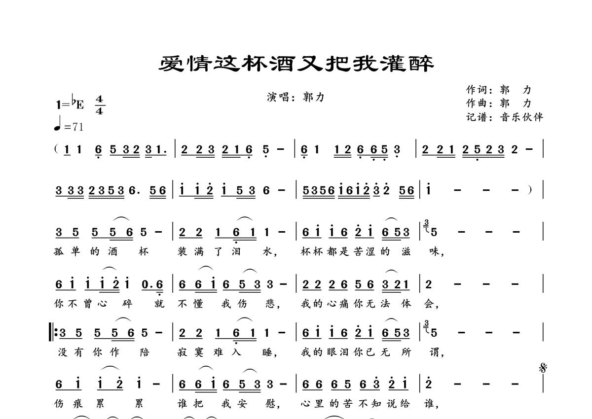 《爱情这杯酒又把我灌醉》是郭力演唱的一首歌曲,拍号为4/4拍,歌曲速度为每分钟71拍,这份简谱共有一张高清图谱,图谱由 @音乐伙伴 编配上传。
