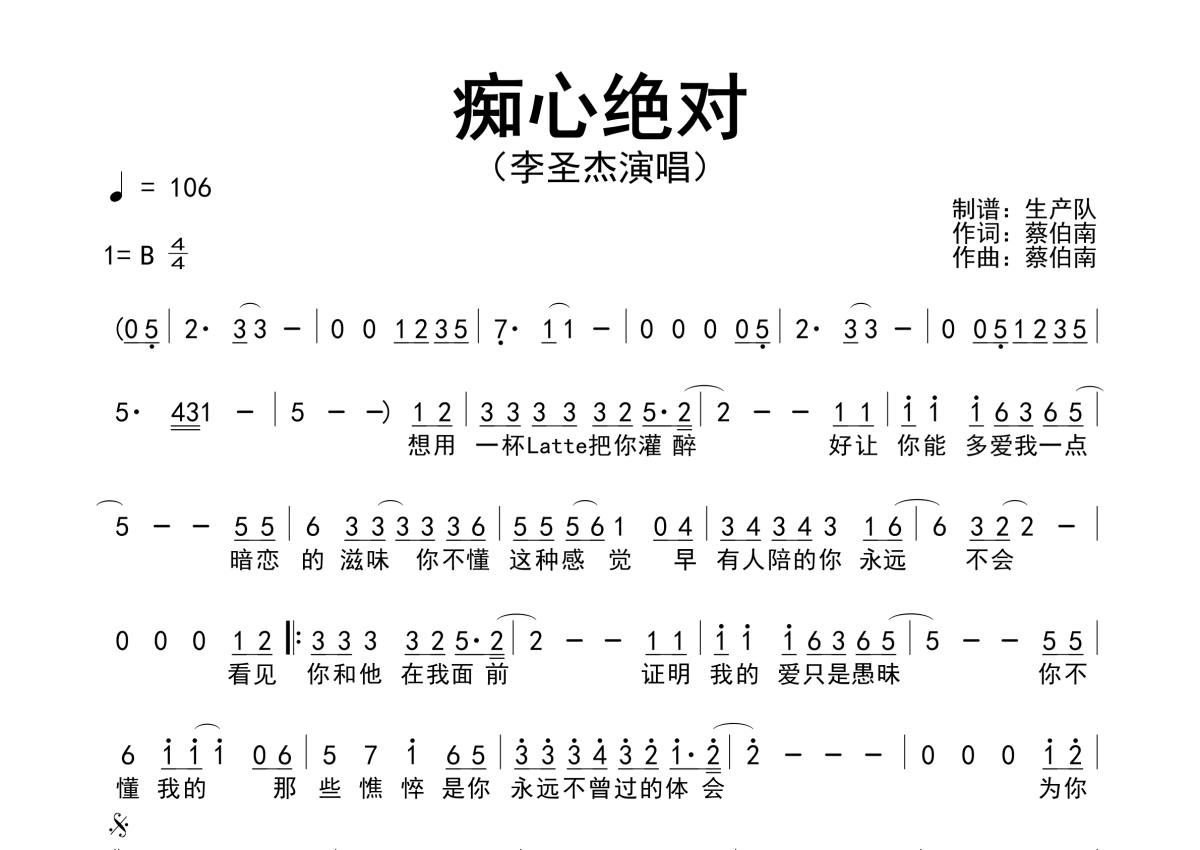 《痴心绝对》是李圣杰演唱的一首歌曲,原版简谱,拍号为4/4拍,歌曲速度为每分钟106拍,这份简谱共有一张高清图谱,图谱由 @生产队 编配上传李圣杰演唱的经典歌曲《痴心绝对》原版简谱。