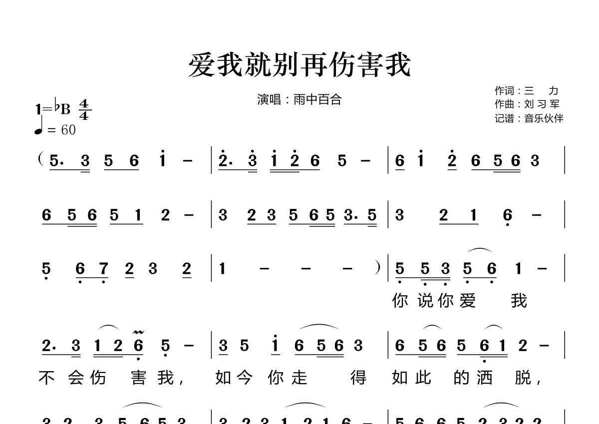《爱我就别再伤害我》是雨中百合演唱的一首歌曲,这份简谱共有两张高清图谱,图谱由 @音乐伙伴 编配上传。