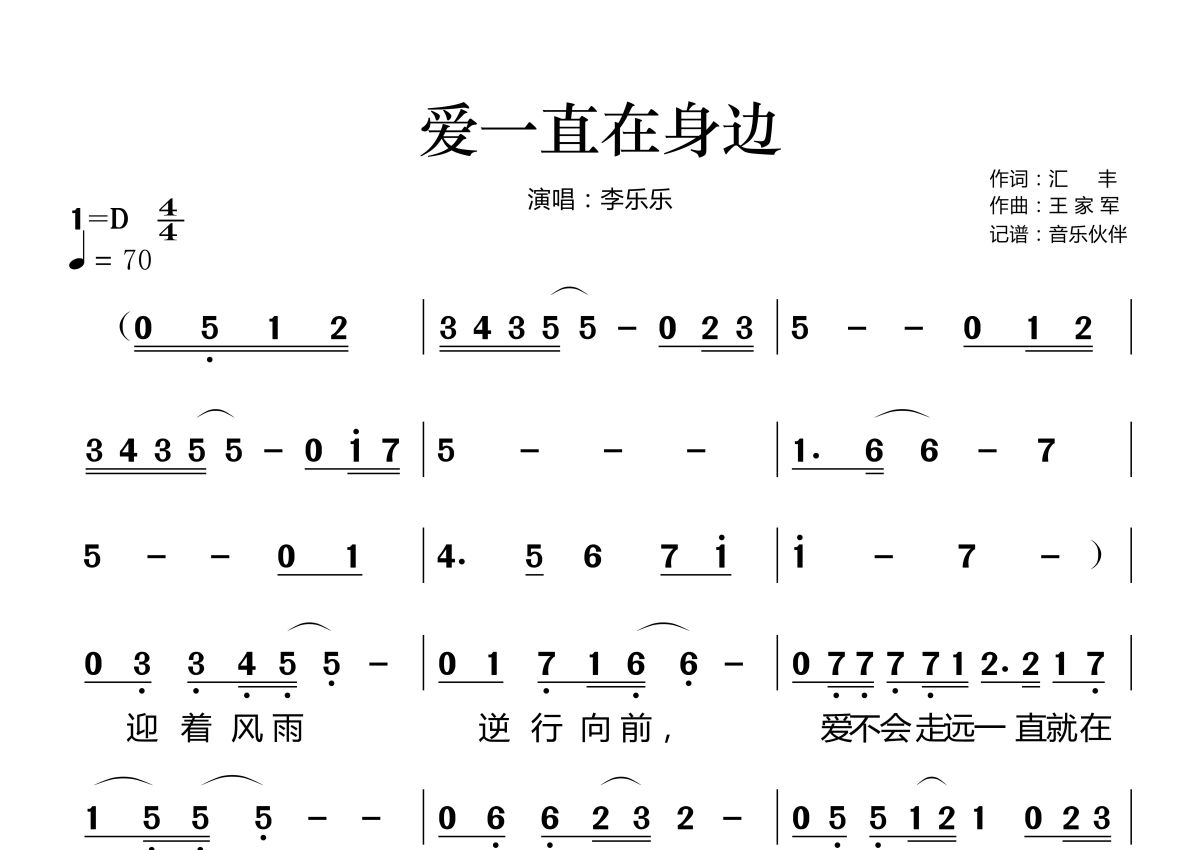爱一直在身边简谱 - 李乐乐演唱