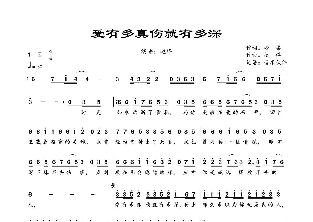 《爱有多真伤就有多深》是赵洋演唱的一首歌曲,拍号为4/4拍,歌曲速度为每分钟60拍,这份简谱共有一张高清图谱,图谱由 @音乐伙伴 编配上传。