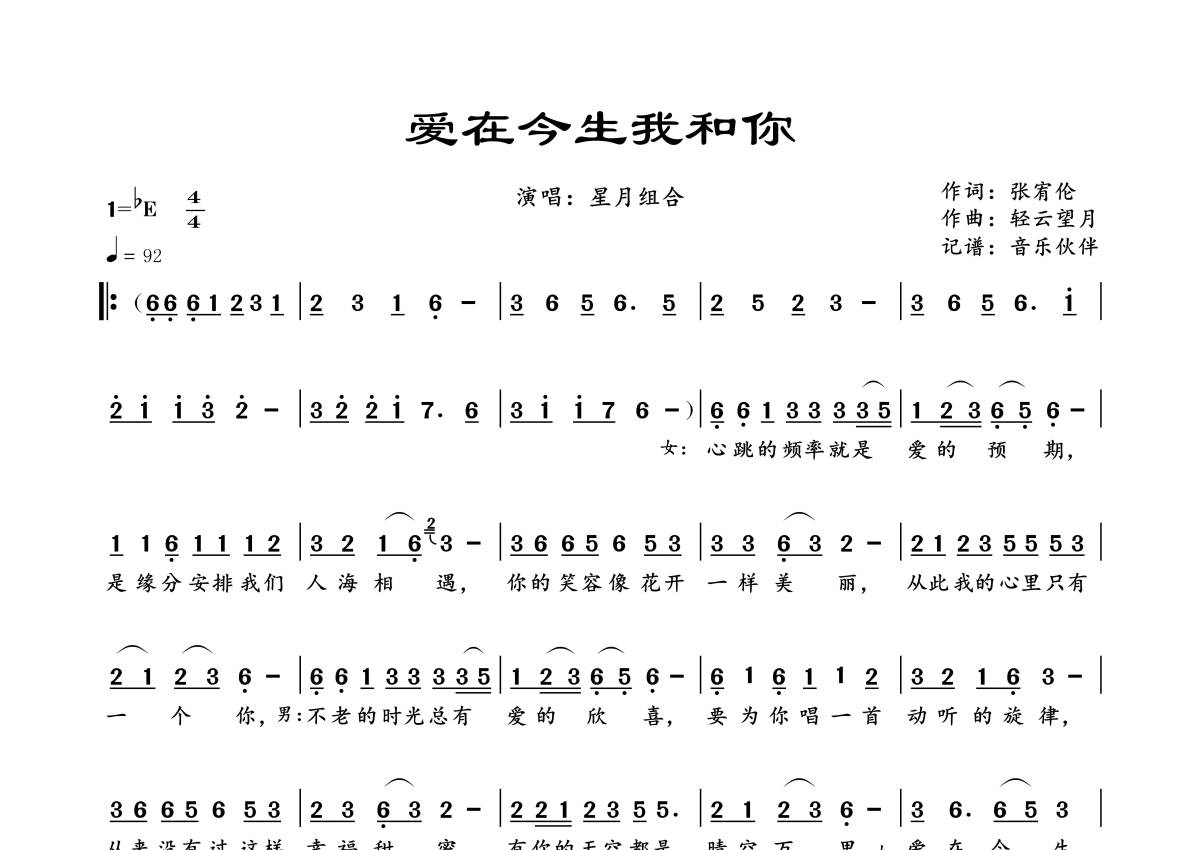 《爱在今生我和你》是星月组合演唱的一首歌曲,拍号为4/4拍,歌曲速度为每分钟92拍,这份简谱共有一张高清图谱,图谱由 @音乐伙伴 编配上传。