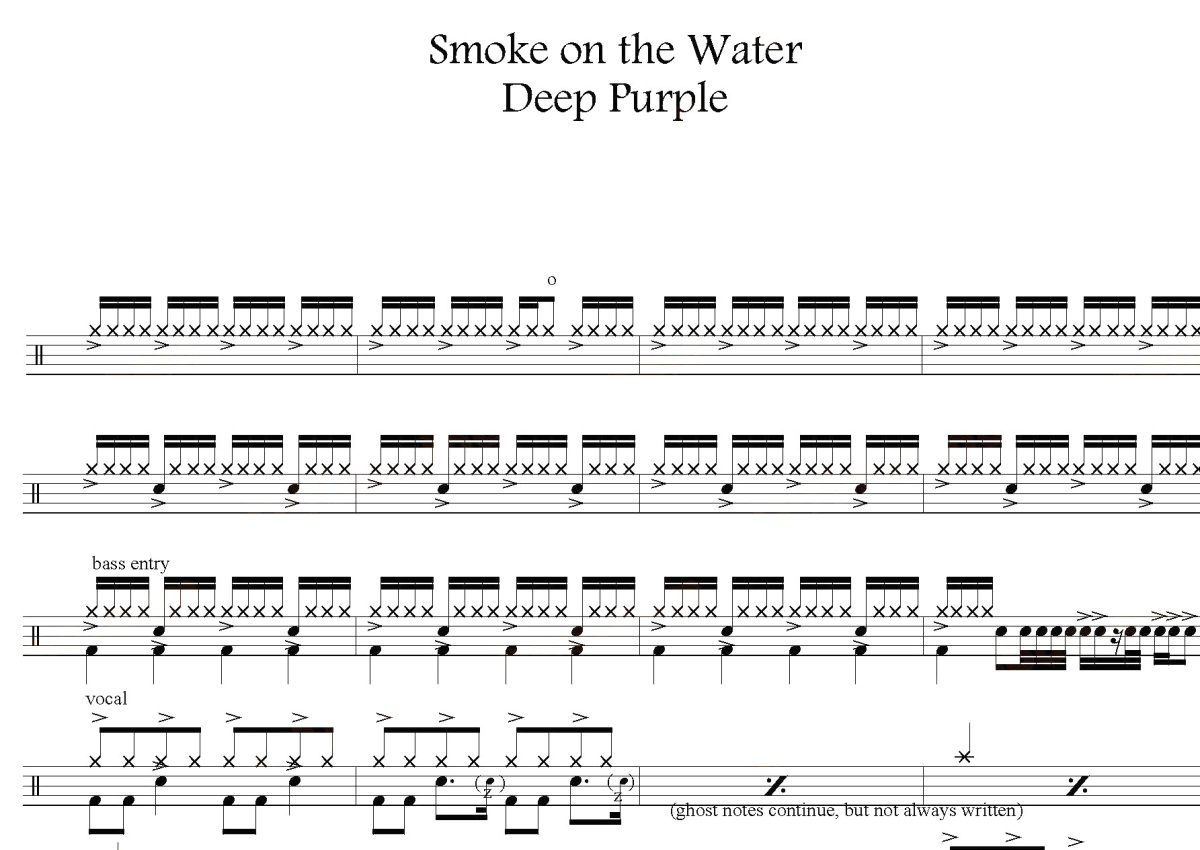 《Smoke on the Water》是Deep Purple演唱的一首歌曲,这份鼓谱共有三张高清图谱,图谱由 @打鼓谱 编配上传,图谱使用五线谱编配,使用这份Smoke on the Water架子鼓谱,你将能够轻松地敲打出这首Deep Purple的Smoke on the Water,快来尝试吧。《Smoke on the Water》是英国摇滚乐队Deep Purple的一首歌曲,收录在第六张录音室专辑《Machine Head》(1972年)中。在2004年,滚石杂志评出的“历史上最伟大的500首歌曲”中位列第434位。Deep Purple(深紫乐队),英国摇滚乐队,成立于1968年,是与Led Zeppelin和Black Sabbath并列重金属和现代硬摇滚乐的先驱乐队,尽管部分乐队成员认为他们的风格不属于任何一个流派。深紫乐队的音乐风格融汇了古典、布鲁斯摇滚、前卫摇滚的元素。乐队曾被吉。