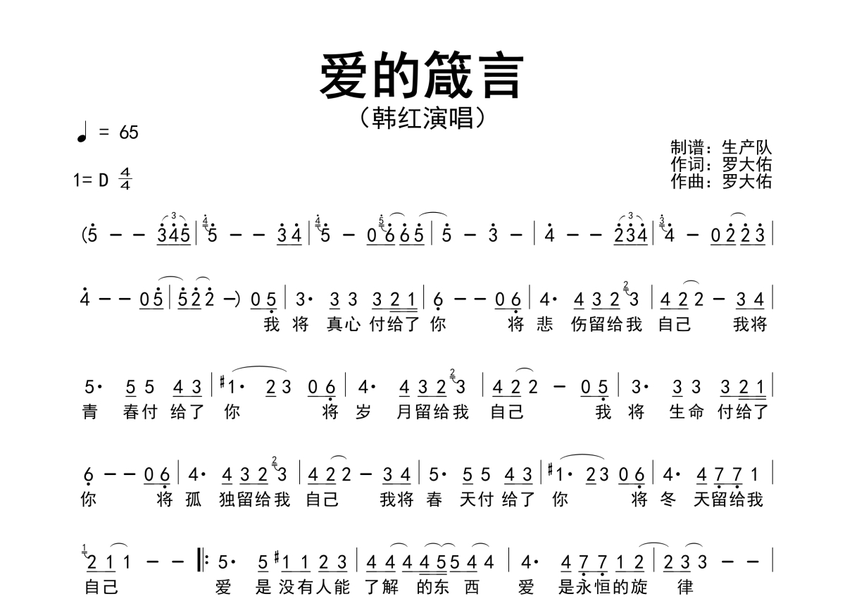 《爱的箴言》是韩红演唱的一首歌曲,原版简谱,拍号为4/4拍,歌曲速度为每分钟65拍,这份简谱共有一张高清图谱,图谱由 @生产队 编配上传韩红演唱的经典歌曲《爱的箴言》原版简谱。
