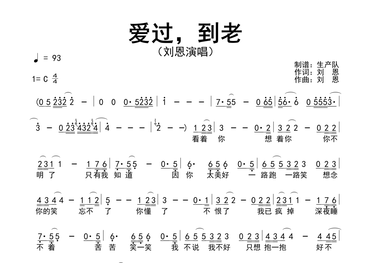 《爱过,到老》是刘恩演唱的一首歌曲,原版简谱,拍号为4/4拍,歌曲速度为每分钟93拍,这份简谱共有一张高清图谱,图谱由 @生产队 编配上传刘恩演唱的民谣歌曲《爱过,到老》原版简谱。