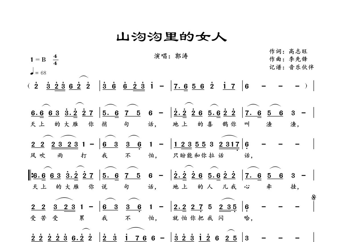 《山沟沟里的女人》是郭涛演唱的一首歌曲,拍号为4/4拍,歌曲速度为每分钟68拍,这份简谱共有一张高清图谱,图谱由 @音乐伙伴 编配上传。