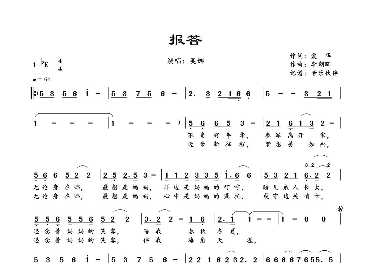 《报答》是吴娜演唱的一首歌曲,拍号为4/4拍,歌曲速度为每分钟64拍,这份简谱共有一张高清图谱,图谱由 @音乐伙伴 编配上传。