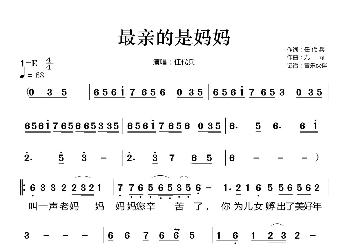最亲的是妈妈简谱 - 任代兵演唱