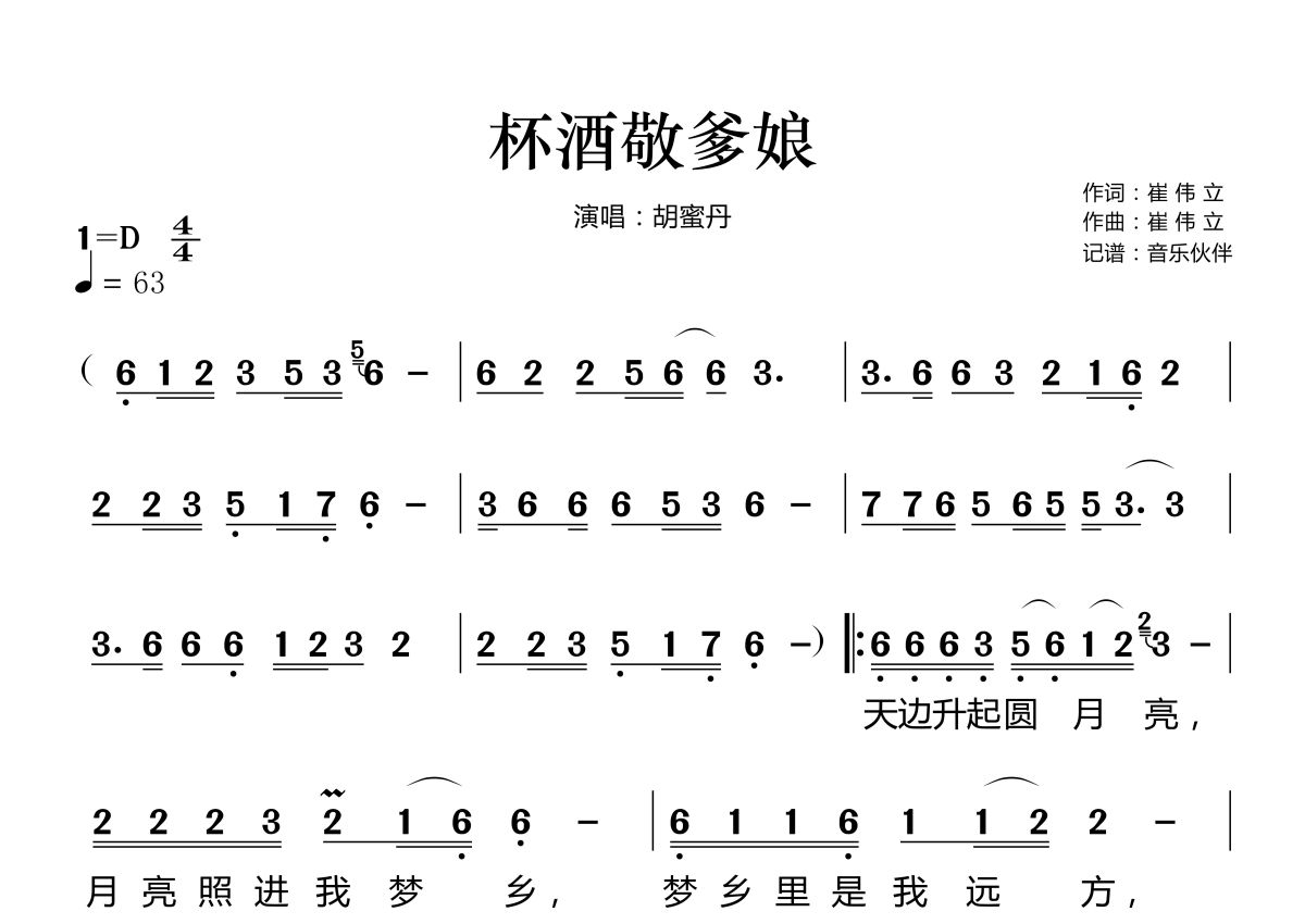杯酒敬爹娘简谱 - 胡蜜丹演唱