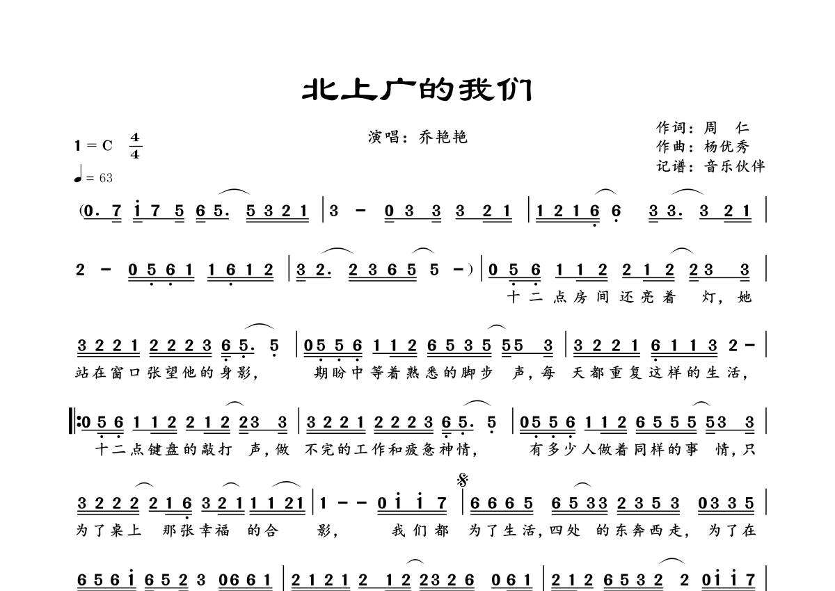 《北上广的我们》是乔艳艳演唱的一首歌曲,拍号为4/4拍,歌曲速度为每分钟63拍,这份简谱共有一张高清图谱,图谱由 @音乐伙伴 编配上传。