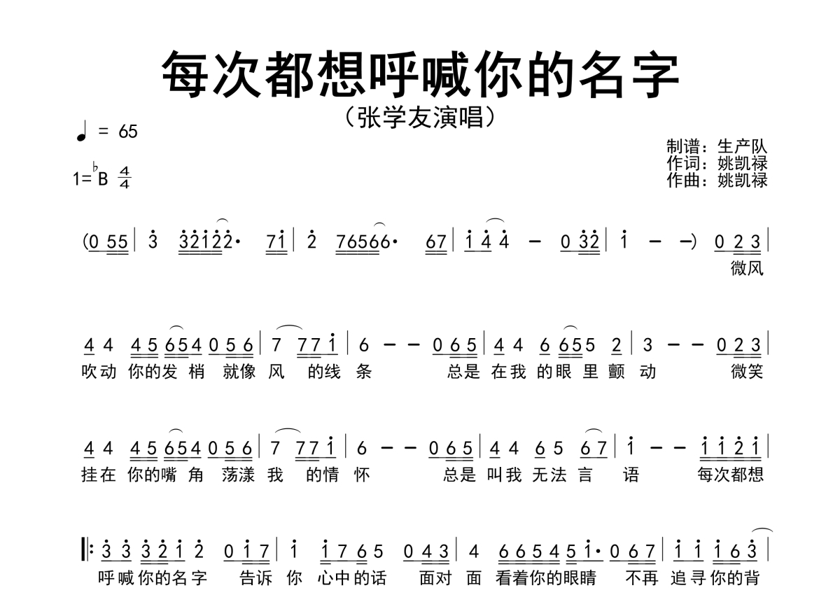 《每次都想呼喊你的名字》是张学友演唱的一首歌曲,原版简谱,拍号为4/4拍,歌曲速度为每分钟65拍,这份简谱共有一张高清图谱,图谱由 @生产队 编配上传张学友演唱的经典歌曲《每次都想呼喊你的名字》原版简谱。