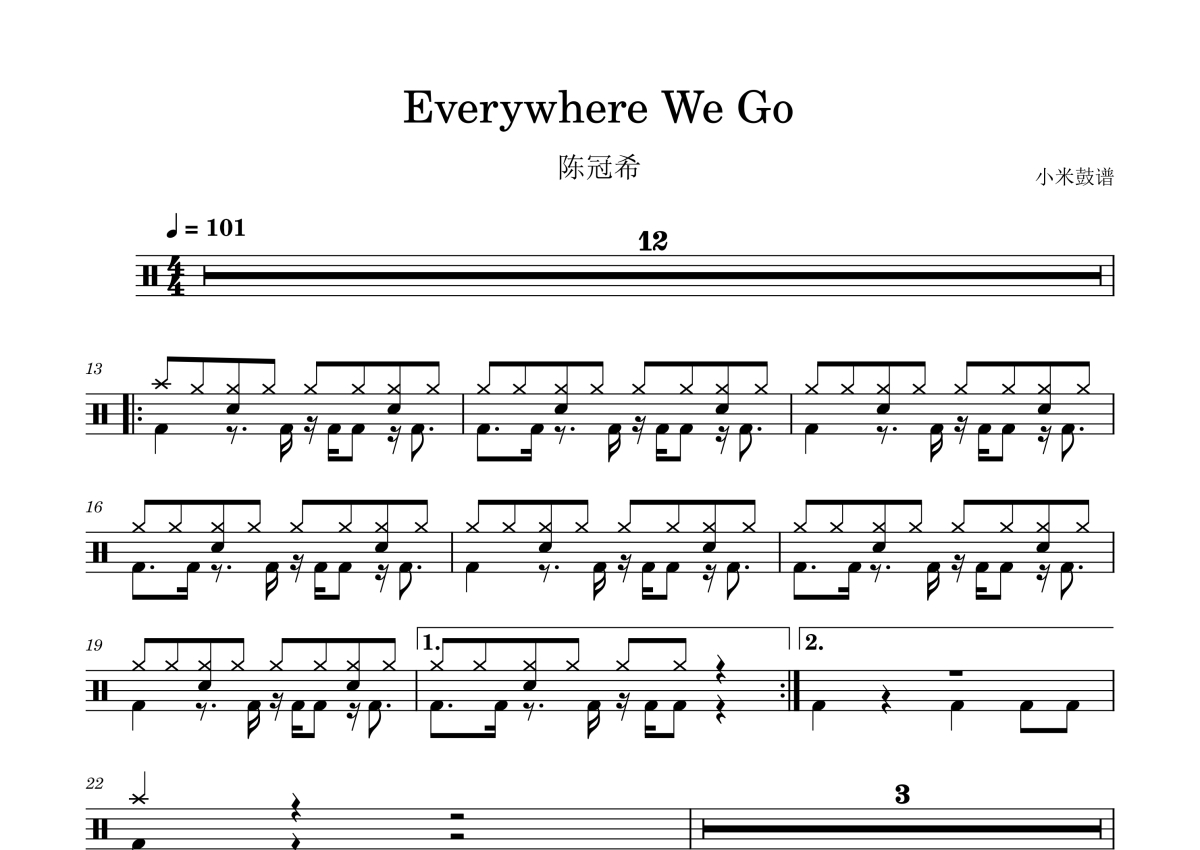 《Everywhere We Go》是陈冠希/厨房仔/MC仁/应采儿演唱的一首歌曲,拍号为4/4拍,歌曲速度为每分钟101拍,这份架子鼓谱共有两张高清图谱,图谱由 @小米鼓谱 编配上传,图谱使用五线谱编配,使用这份Everywhere We Go架子鼓谱,你将能够轻松地敲打出这首陈冠希/厨房仔/MC仁/应采儿的Everywhere We Go,快来尝试吧。