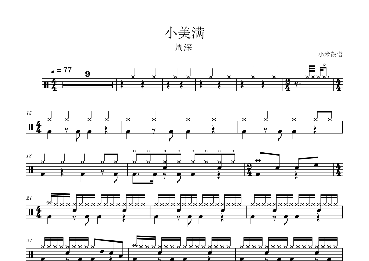 《小美满》是周深演唱的一首歌曲,拍号为4/4拍,歌曲速度为每分钟76拍,这份架子鼓谱共有两张高清图谱,图谱由 @小米鼓谱 编配上传,图谱使用五线谱编配,使用这份小美满架子鼓谱,你将能够轻松地敲打出这首周深的小美满,快来尝试吧。