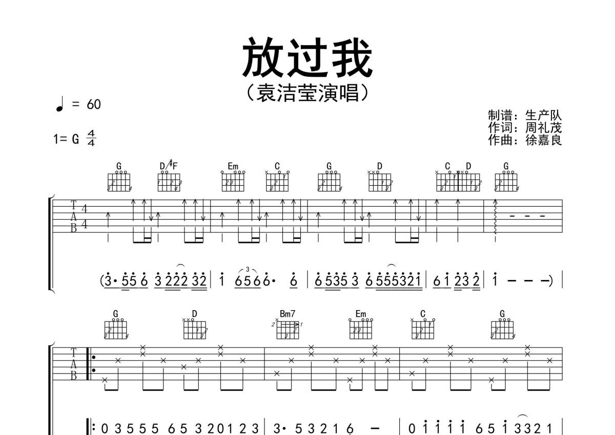 《放过我》是袁洁莹演唱的一首歌曲,精编完美版,拍号为4/4拍,歌曲速度为每分钟60拍,歌曲原调为G调,本吉他谱采用的是G调指法编配,演奏时不需要使用变调夹即为原调,这份吉他谱共有三张高清图谱,图谱由 @生产队 编配上传,图谱使用六线谱编配,包含吉他和弦指法、简谱以及歌词部分,使用这份放过我吉他谱,可以让你更加方便地掌握这首歌曲的弹唱技巧,快来尝试吧。《放过我》是袁洁莹演唱的一首粤语歌曲,由徐嘉良作曲,周礼茂作词,收录在专辑《袁洁莹》中。本吉他谱根据原版G调指法编配,精准的前奏、间奏、尾奏和SOLO编配,怀旧经典!。