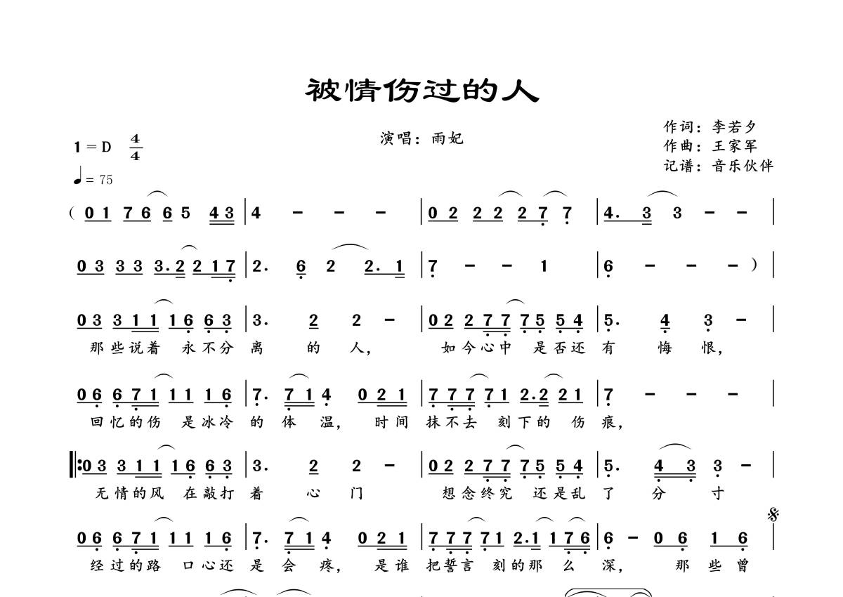 《被情伤过的人》是雨妃演唱的一首歌曲,拍号为4/4拍,歌曲速度为每分钟75拍,这份简谱共有一张高清图谱,图谱由 @音乐伙伴 编配上传。