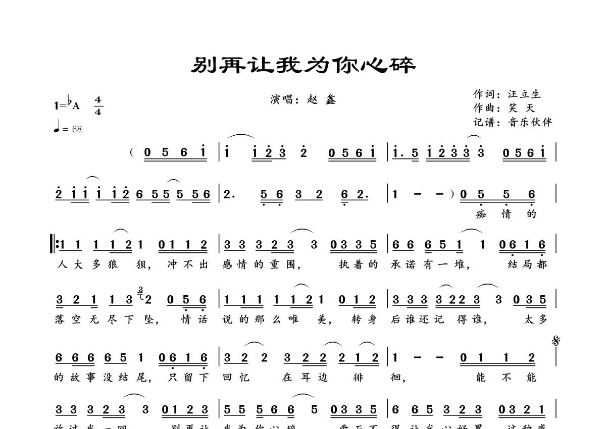 《别再让我为你心碎》是赵鑫演唱的一首歌曲,拍号为4/4拍,歌曲速度为每分钟68拍,这份简谱共有一张高清图谱,图谱由 @音乐伙伴 编配上传。