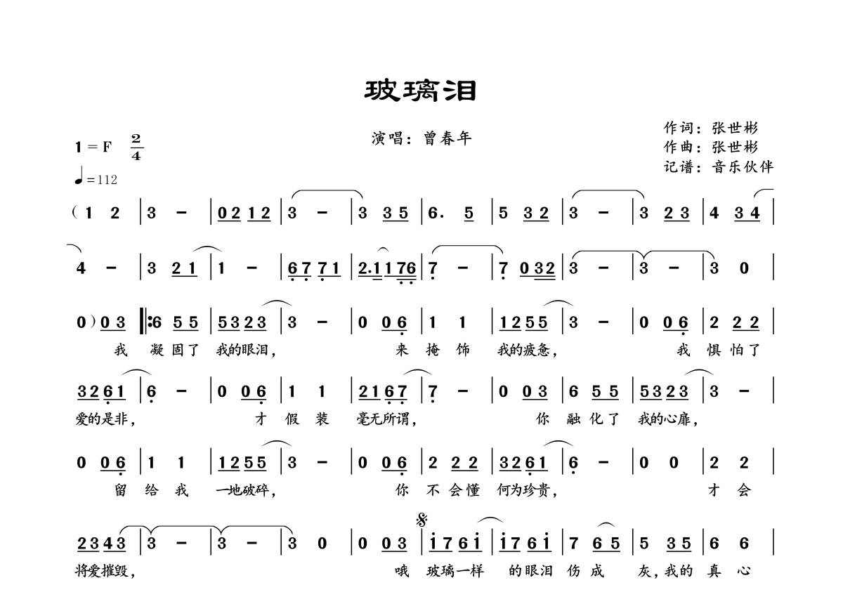 《玻璃泪》是曾春年演唱的一首歌曲,拍号为2/4拍,歌曲速度为每分钟112拍,这份简谱共有一张高清图谱,图谱由 @音乐伙伴 编配上传。