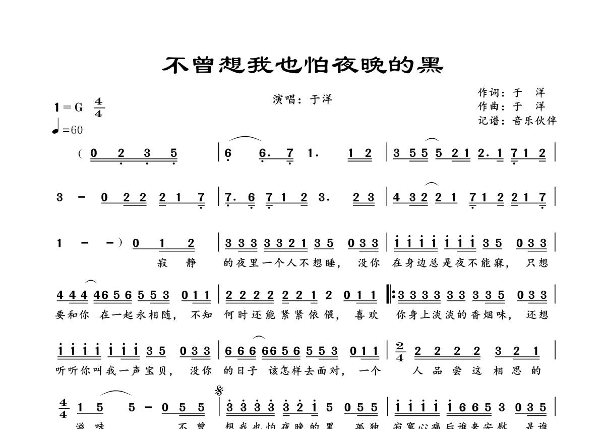 《不曾想我也怕夜晚的黑》是于洋演唱的一首歌曲,拍号为4/4拍,歌曲速度为每分钟60拍,这份简谱共有一张高清图谱,图谱由 @音乐伙伴 编配上传。