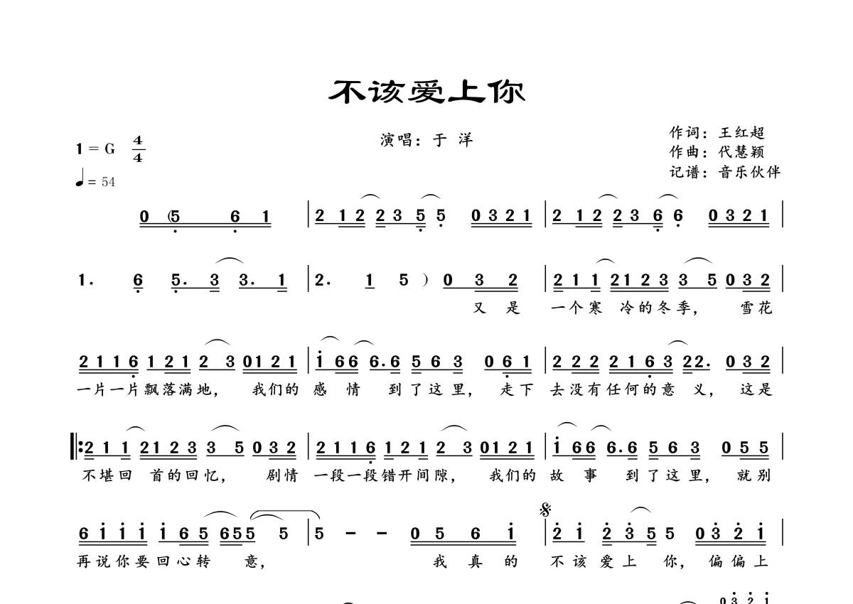《不该爱上你》是于洋演唱的一首歌曲,拍号为4/4拍,歌曲速度为每分钟54拍,这份简谱共有一张高清图谱,图谱由 @音乐伙伴 编配上传。