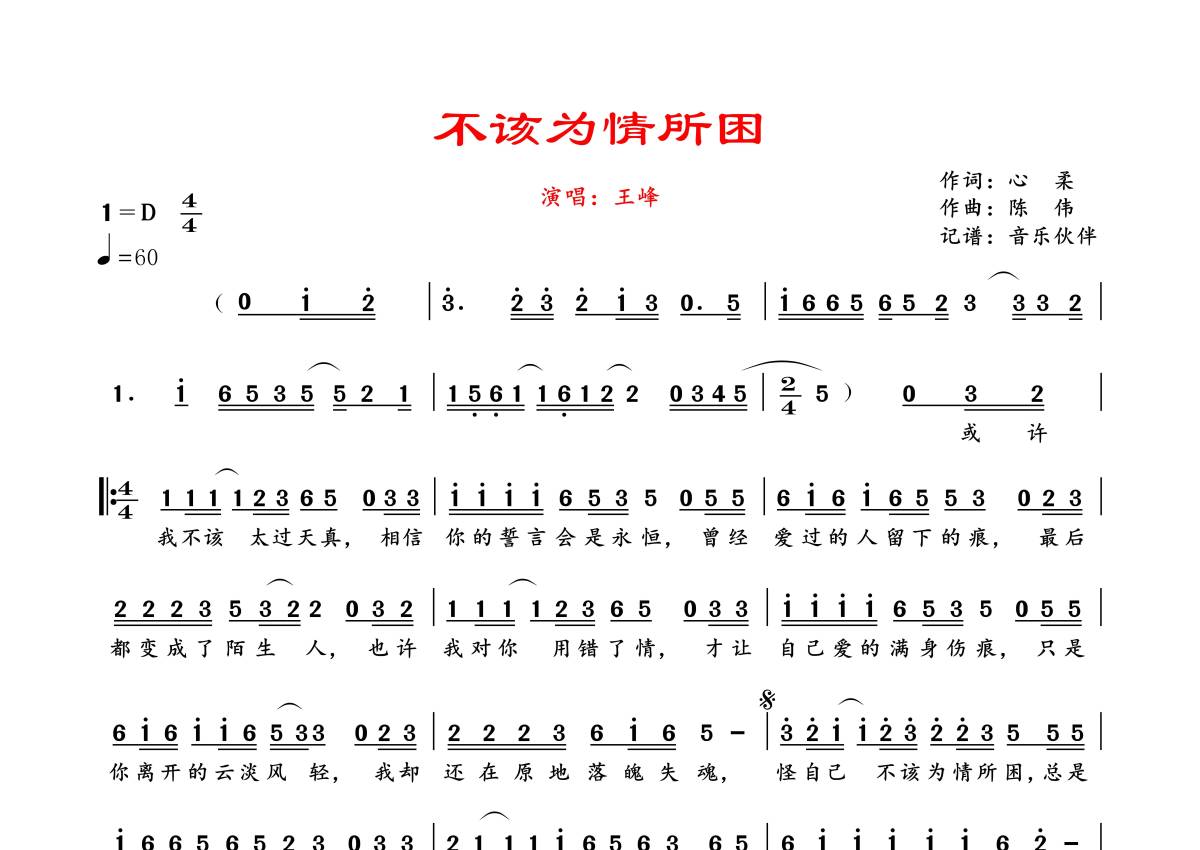 《不该为情所困》是王峰演唱的一首歌曲,拍号为4/4拍,歌曲速度为每分钟60拍,这份简谱共有一张高清图谱,图谱由 @音乐伙伴 编配上传。