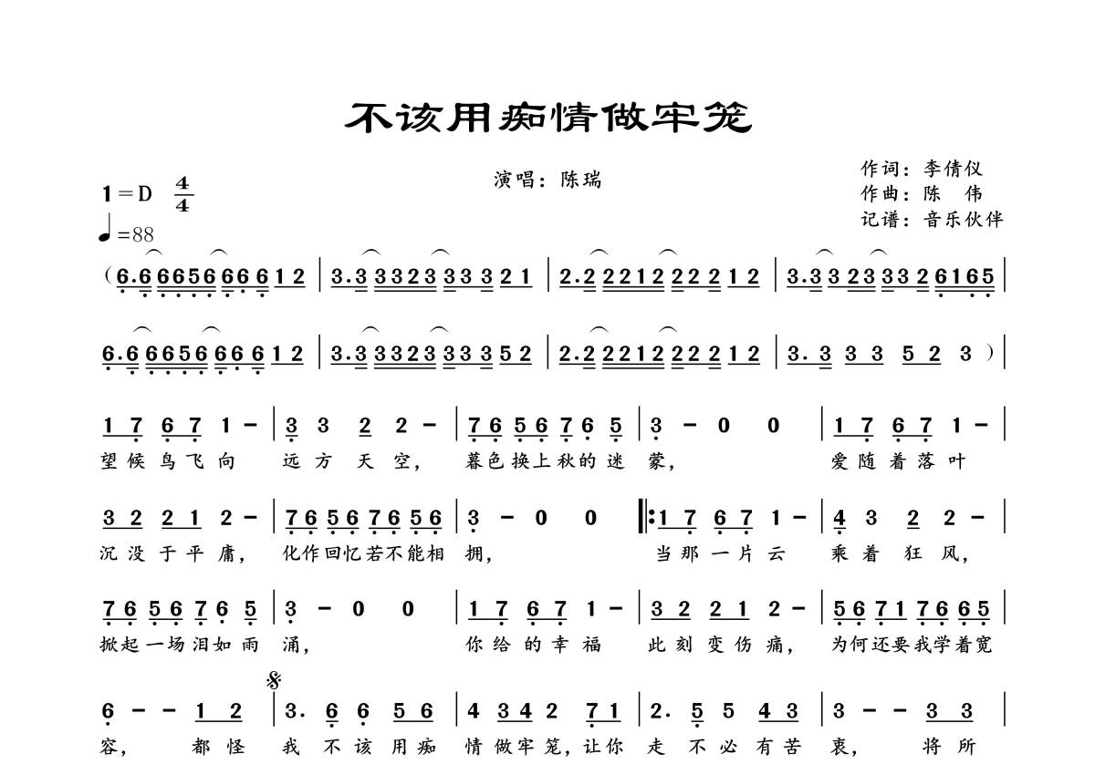 《不该用痴情做牢笼》是陈瑞演唱的一首歌曲,拍号为4/4拍,歌曲速度为每分钟88拍,这份简谱共有一张高清图谱,图谱由 @音乐伙伴 编配上传。