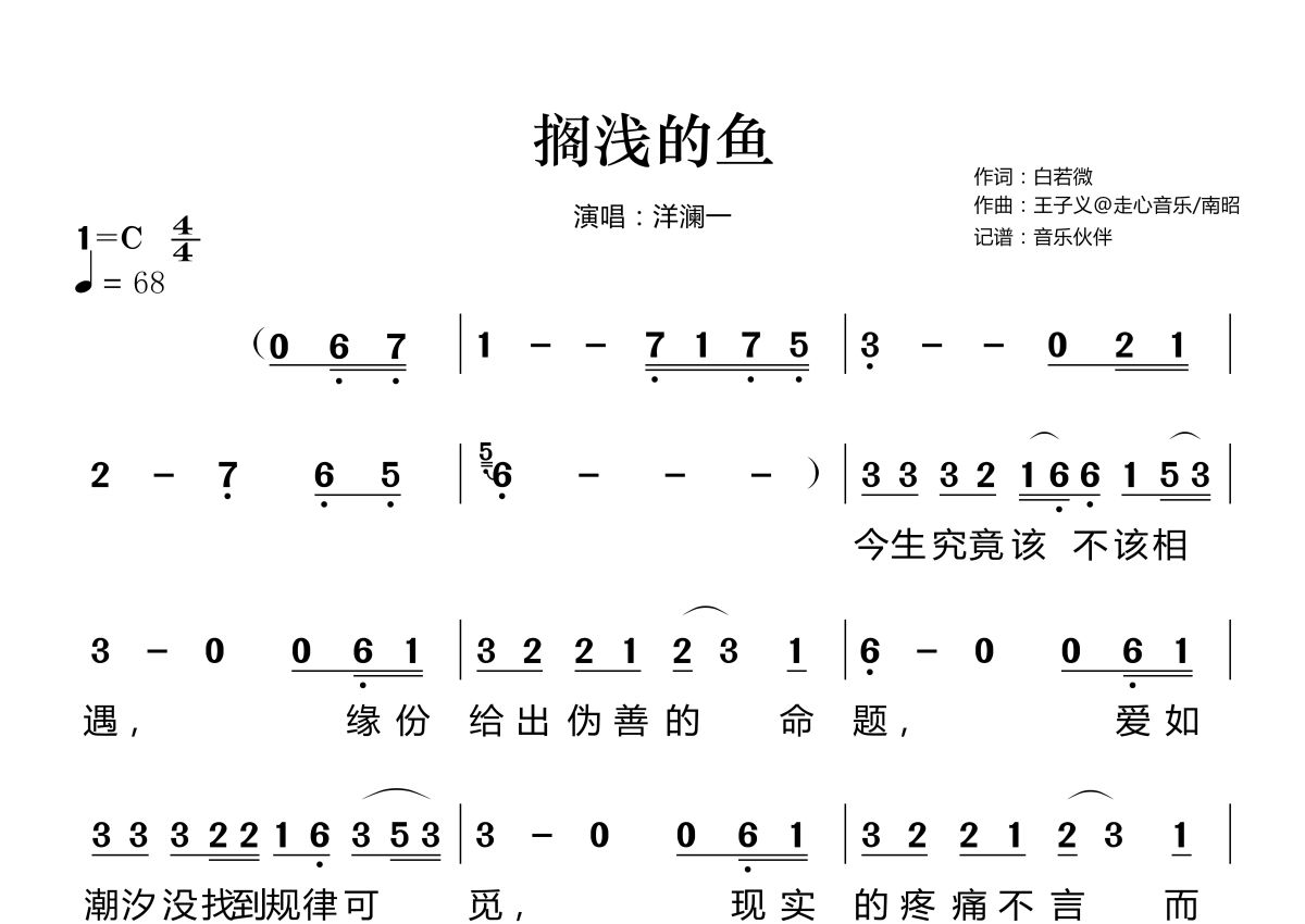 《搁浅的鱼》是洋澜一演唱的一首歌曲,拍号为4/4拍,这份简谱共有两张高清图谱,图谱由 @音乐伙伴 编配上传。