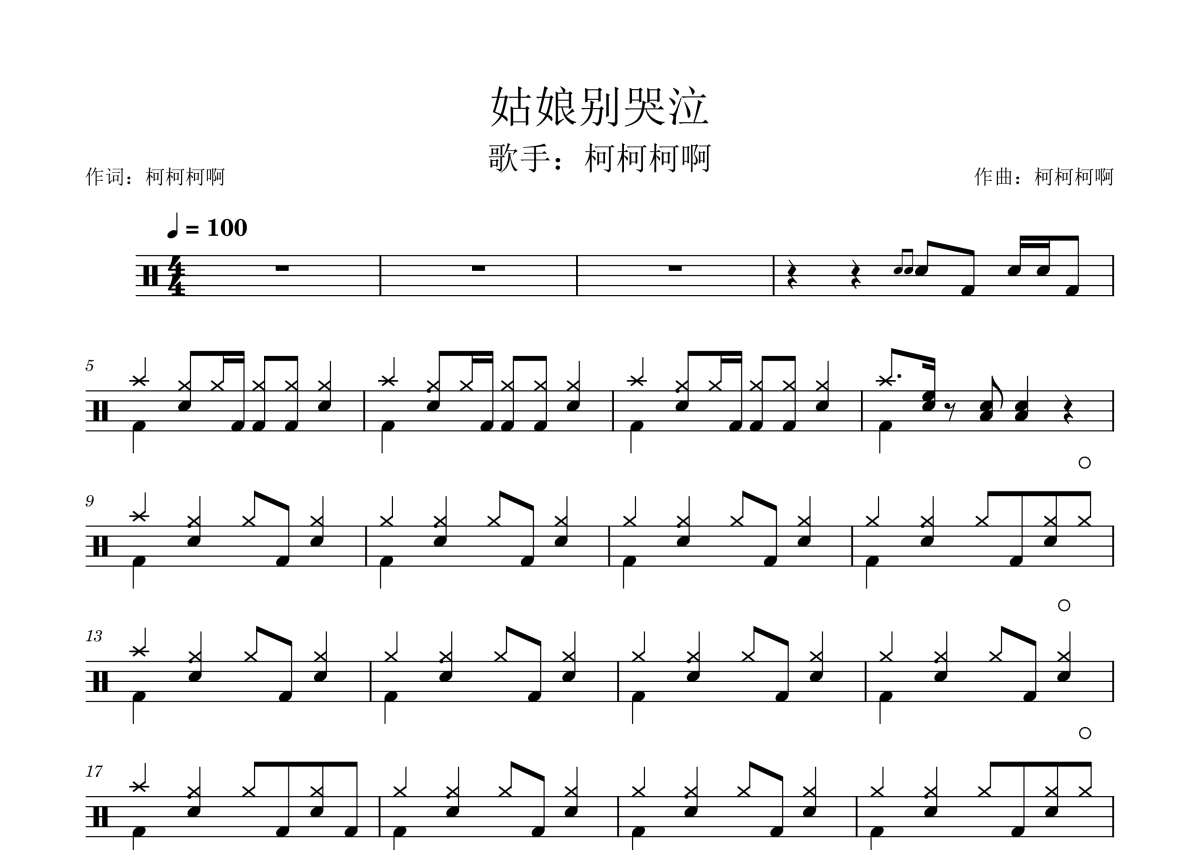 柯柯柯啊《姑娘别哭泣》架子鼓谱