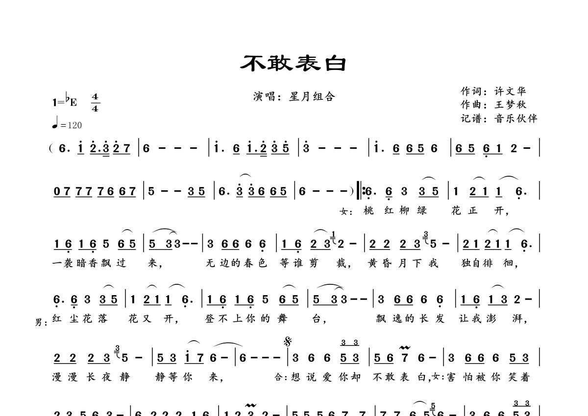 《不敢表白》是星月组合演唱的一首歌曲,拍号为4/4拍,歌曲速度为每分钟120拍,这份简谱共有一张高清图谱,图谱由 @音乐伙伴 编配上传。
