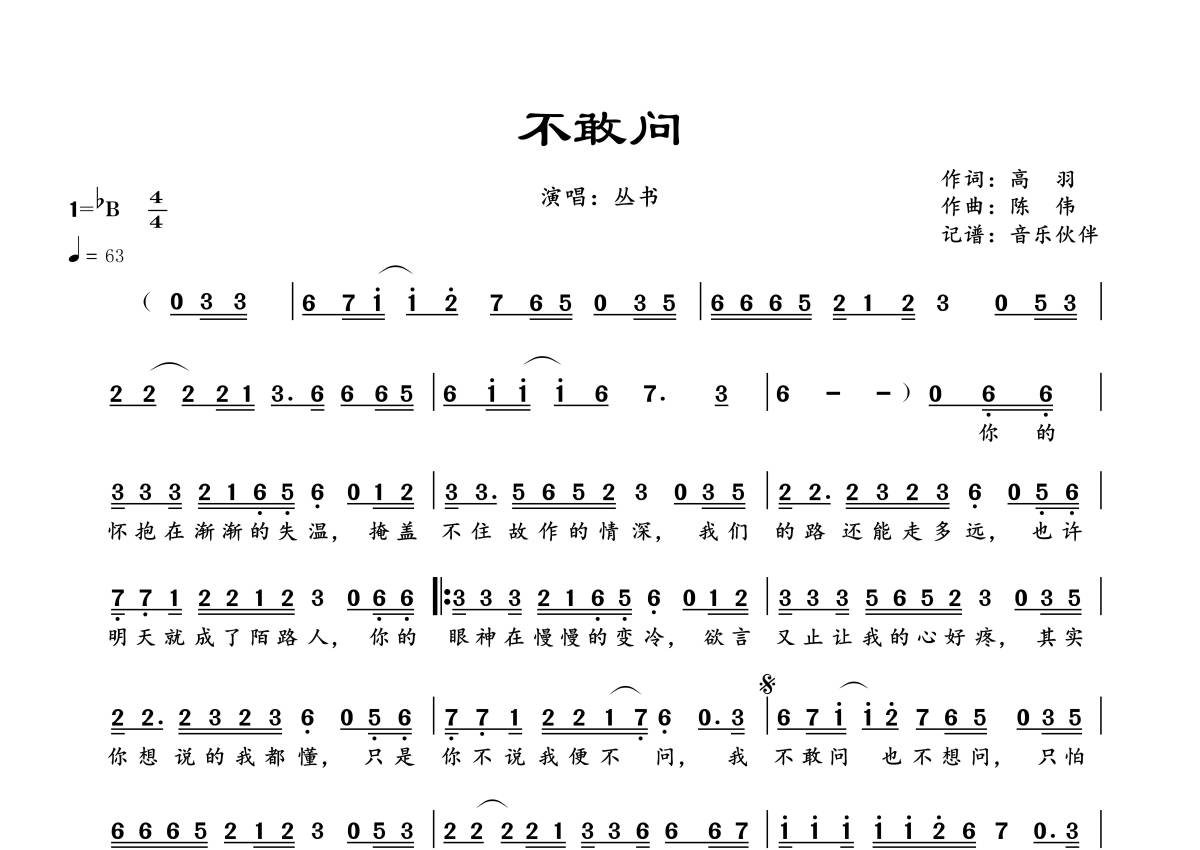 《不敢问》是丛书演唱的一首歌曲,拍号为4/4拍,歌曲速度为每分钟63拍,这份简谱共有一张高清图谱,图谱由 @音乐伙伴 编配上传。