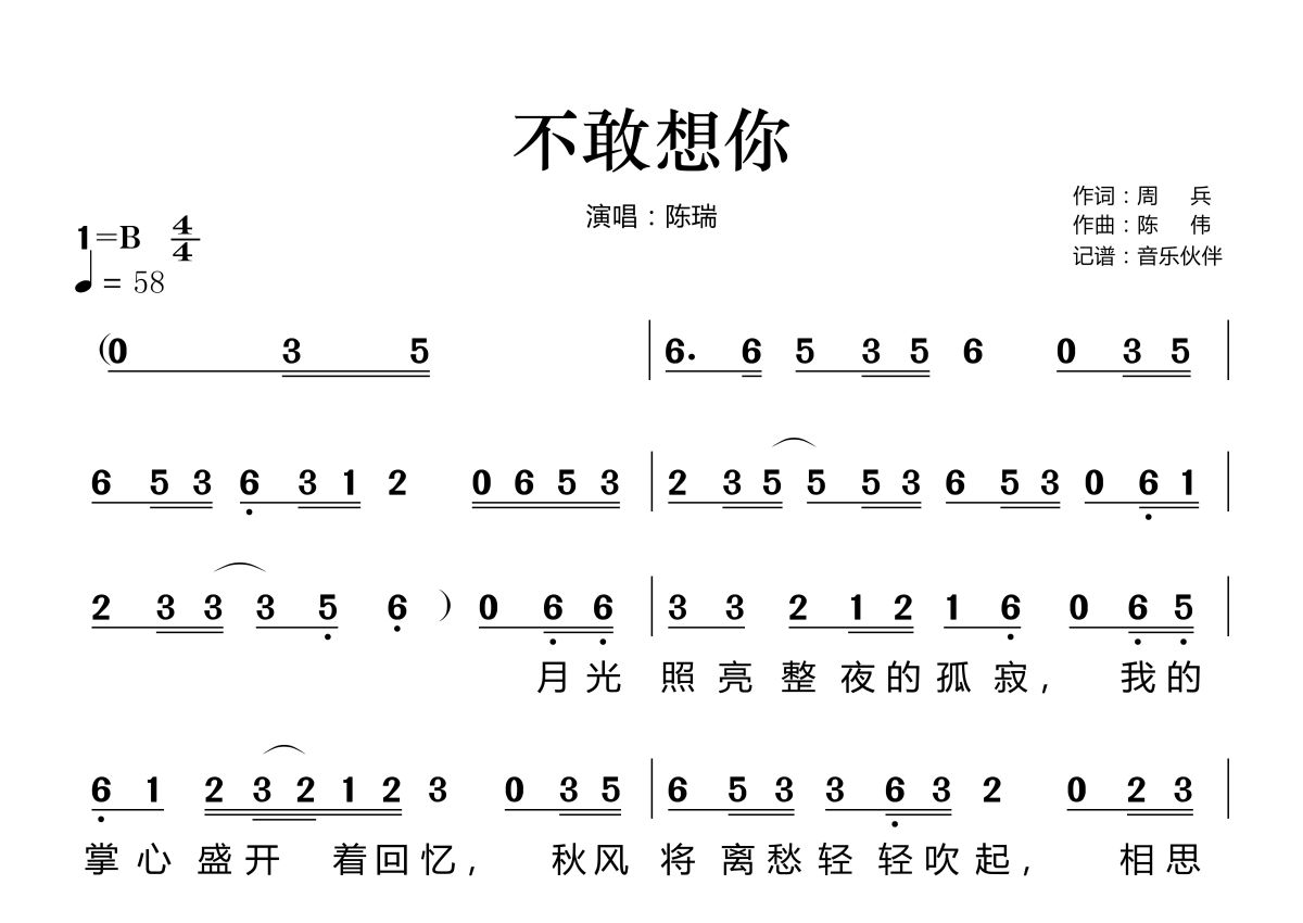 《不敢想你》是陈瑞演唱的一首歌曲,这份简谱共有两张高清图谱,图谱由 @音乐伙伴 编配上传。