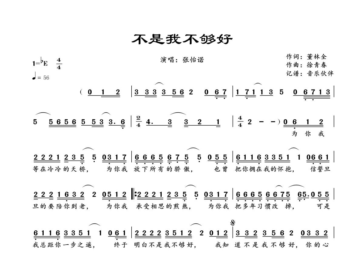 《不是我不够好》是张怡诺演唱的一首歌曲,拍号为4/4拍,歌曲速度为每分钟56拍,这份简谱共有一张高清图谱,图谱由 @音乐伙伴 编配上传。