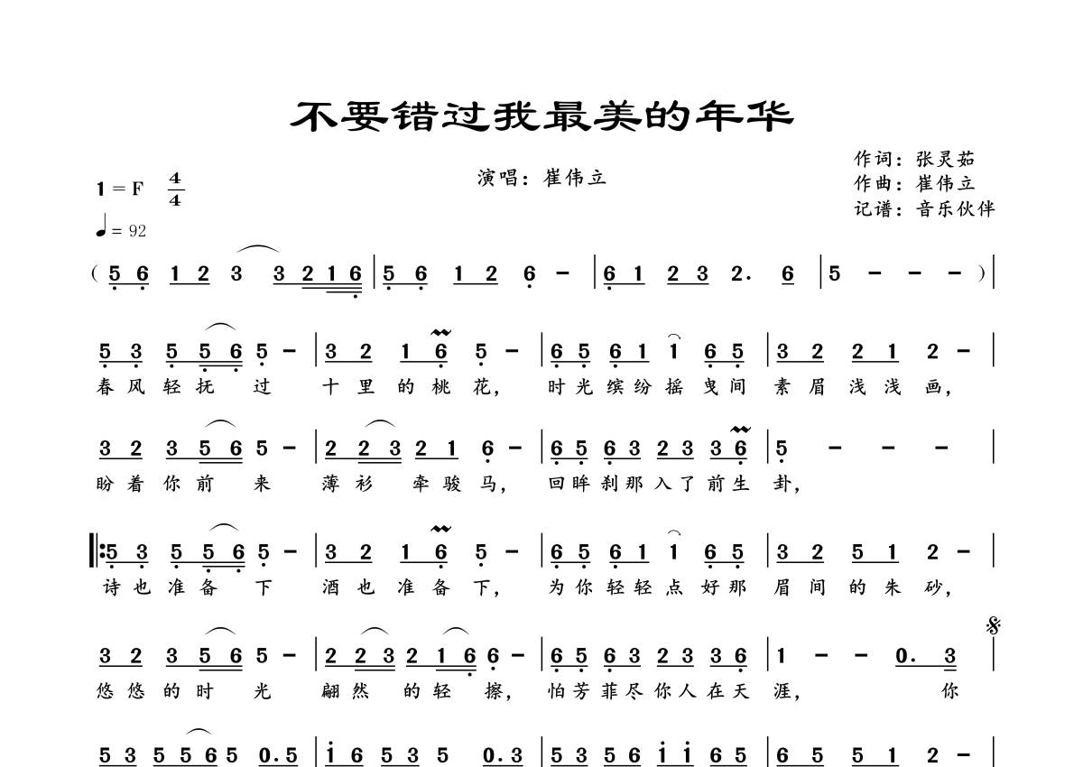 《不要错过我最美的年华》是崔伟立演唱的一首歌曲,拍号为4/4拍,歌曲速度为每分钟92拍,这份简谱共有一张高清图谱,图谱由 @音乐伙伴 编配上传。