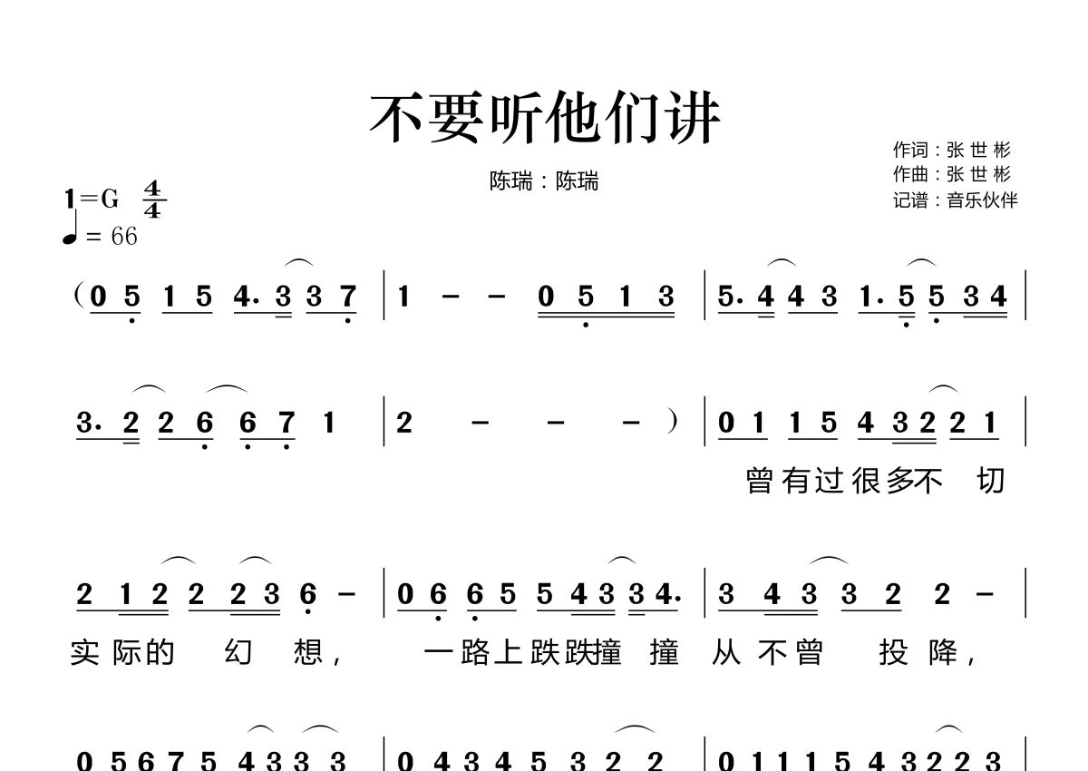《不要听他们讲》是陈瑞演唱的一首歌曲,拍号为4/4拍,歌曲速度为每分钟60拍,这份简谱共有两张高清图谱,图谱由 @音乐伙伴 编配上传。