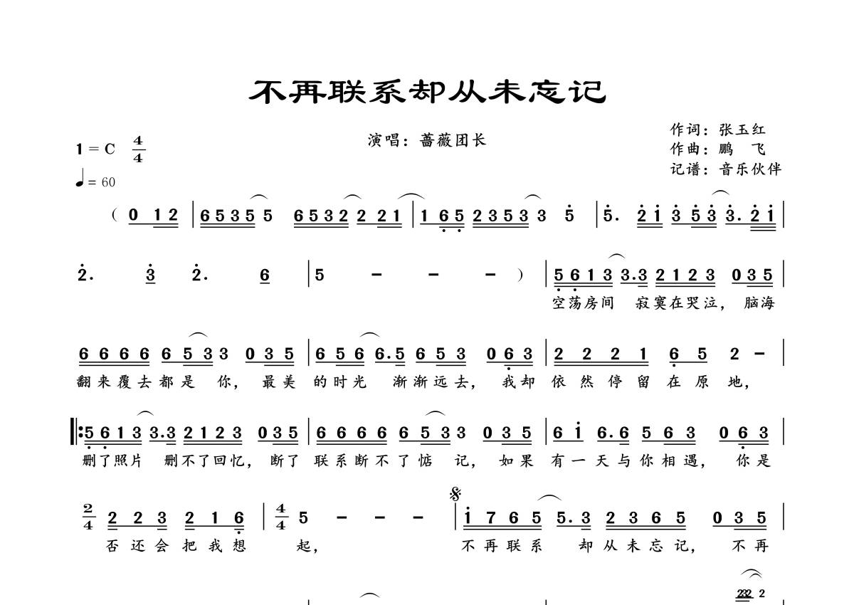 《不再联系却从未忘记》是蔷薇团长演唱的一首歌曲,拍号为4/4拍,歌曲速度为每分钟60拍,这份简谱共有一张高清图谱,图谱由 @音乐伙伴 编配上传。