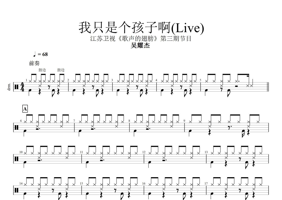 《我只是个孩子啊》是吴耀杰演唱的一首歌曲,这份鼓谱共有两张高清图谱,图谱由 @打鼓谱 编配上传,图谱使用五线谱编配,使用这份我只是个孩子啊架子鼓谱,你将能够轻松地敲打出这首吴耀杰的我只是个孩子啊,快来尝试吧。2017年05月7日晚,江苏卫视《歌声的翅膀》播出了第三期节目,歌声各具特色的孩子们带来了他们动听的演唱。其中,九岁的吴耀杰带来原创词曲的《我只是个孩子》,一字一句、每一个音符都在唱着孩子独有的压力和苦恼。