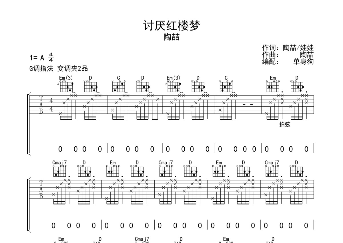 《讨厌红楼梦》是陶喆演唱的一首歌曲,拍号为4/4拍,歌曲原调为A调,但由于原调指法比较难,为了方便弹奏,本吉他谱采用的是G调指法编配,变调夹2品弹奏即为原调,当然也可以根据自己的音域改变变调夹位置,或者通过改变和弦调性,以方便自己弹奏,这份吉他谱共有五张高清图谱,图谱由 @单身狗 编配上传,图谱使用六线谱编配,包含吉他和弦指法、简谱以及歌词部分,使用这份讨厌红楼梦吉他谱,可以让你更加方便地掌握这首歌曲的弹唱技巧,快来尝试吧。