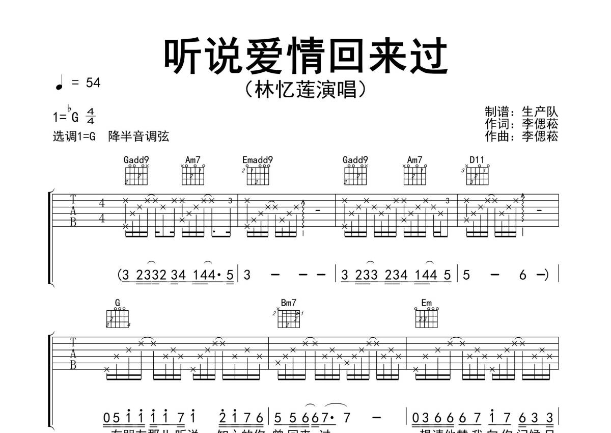 《听说爱情回来过》是林忆莲演唱的一首歌曲,精编完美版,拍号为4/4拍,歌曲速度为每分钟54拍,歌曲原调为Gb调,但由于原调指法比较难,为了方便弹奏,本吉他谱采用的是G调指法编配,降半音调弦弹奏即为原调,当然也可以根据自己的音域决定是否调弦,这份吉他谱共有三张高清图谱,图谱由 @生产队 编配上传,图谱使用六线谱编配,包含吉他和弦指法、简谱以及歌词部分,使用这份听说爱情回来过吉他谱,可以让你更加方便地掌握这首歌曲的弹唱技巧,快来尝试吧。《听说爱情回来过》是由林忆莲演唱的经典歌曲,李偲菘作词、作曲,收录在专辑《Love, Sandy》中。本吉他谱根据原版G调指法编配,完整的前奏、间奏编配,精编完美版,怀旧经典!。
