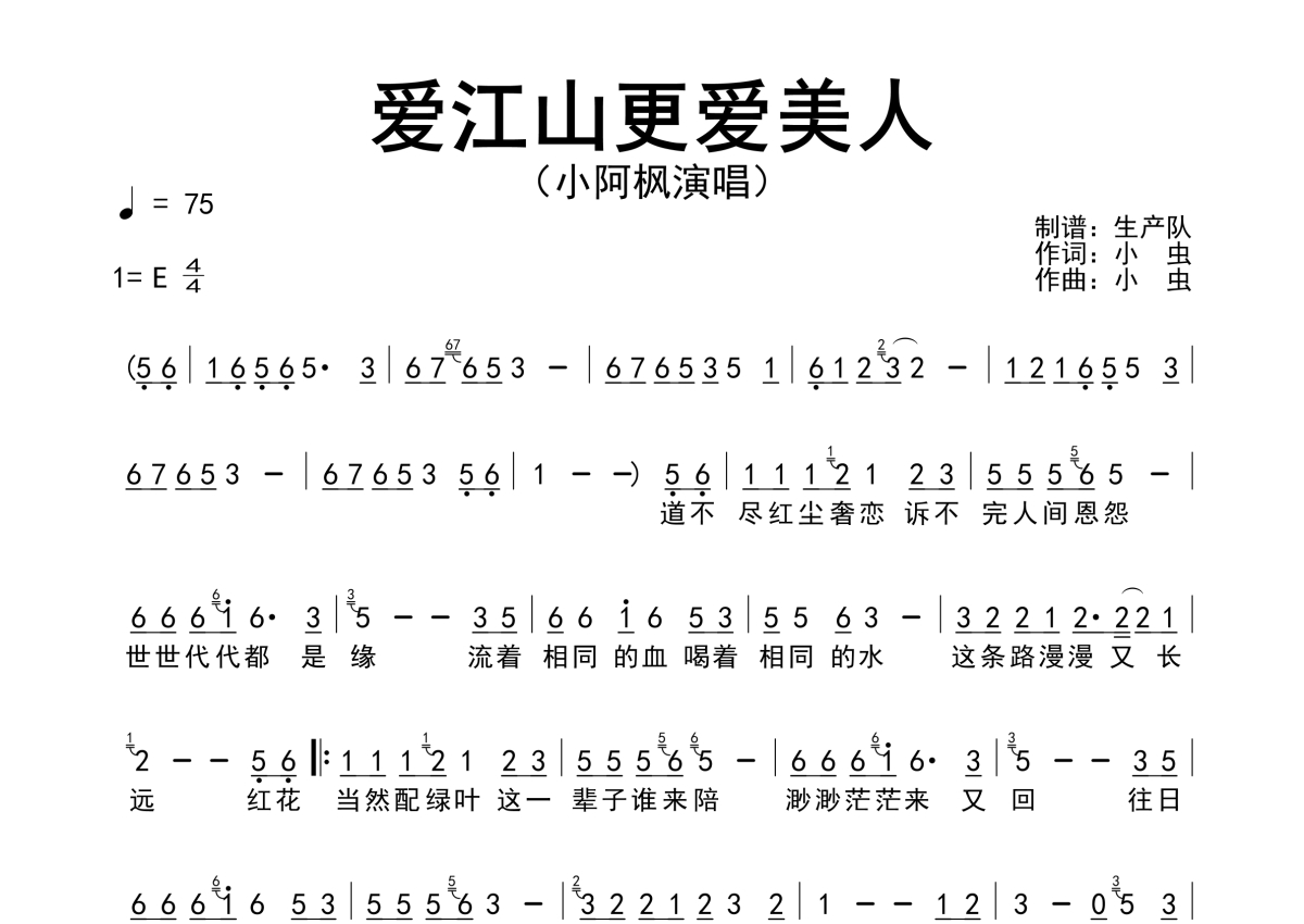 《爱江山更爱美人》是小阿枫演唱的一首歌曲,原版简谱,拍号为4/4拍,歌曲速度为每分钟75拍,这份简谱共有一张高清图谱,图谱由 @生产队 编配上传小阿枫演唱的经典歌曲《爱江山更爱美人》原版简谱。