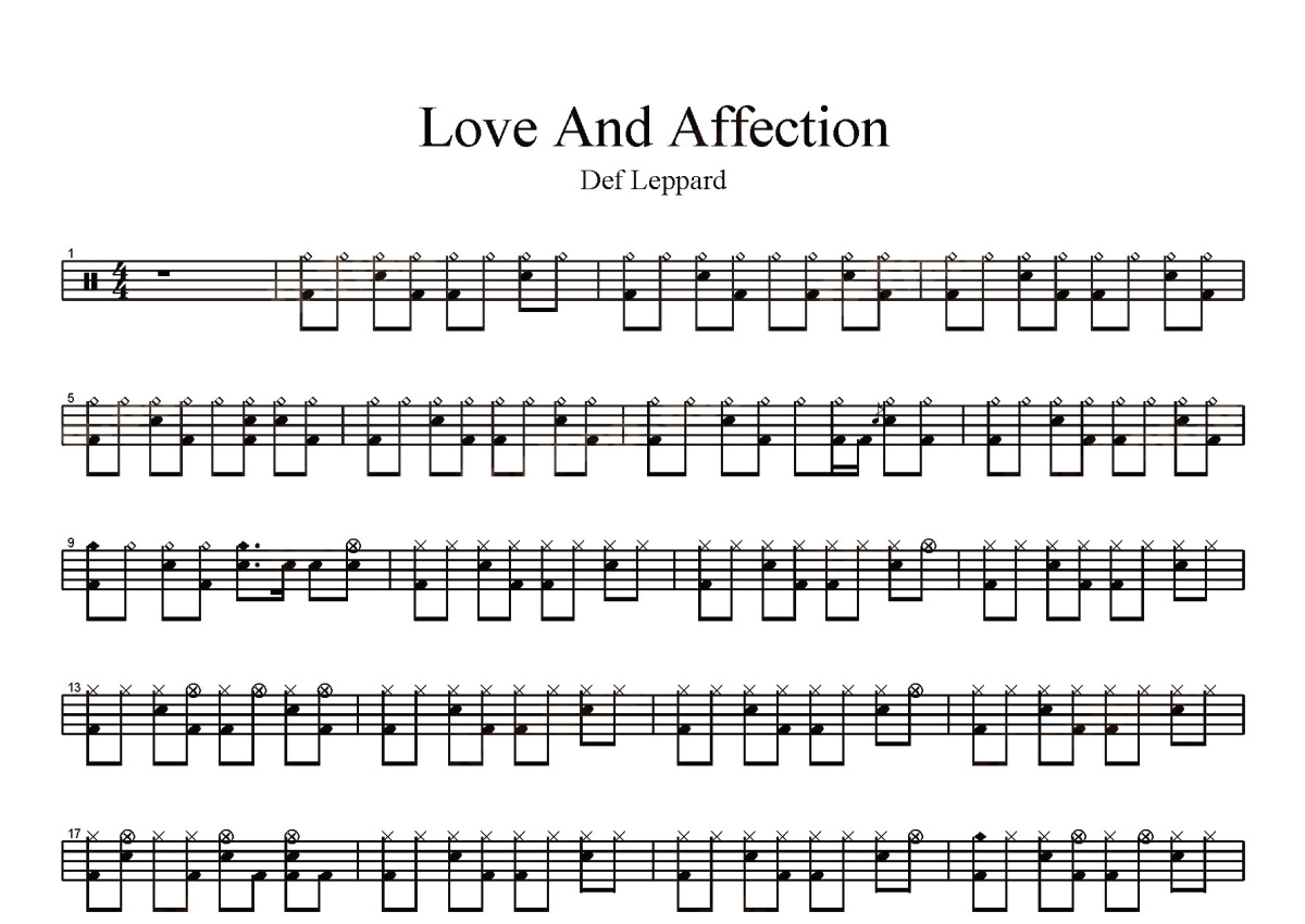 《Love And Affection》是Def Leppard演唱的一首歌曲,这份鼓谱共有三张高清图谱,图谱由 @打鼓谱 编配上传,图谱使用五线谱编配,使用这份Love And Affection架子鼓谱,你将能够轻松地敲打出这首Def Leppard的Love And Affection,快来尝试吧。《Love And Affection》现场版。Def Leppard(威豹乐队)是一支1977年在英国谢菲尔德成立的硬摇滚乐队,现有贝斯手萨维奇(Rick Savage)、主音歌手埃利奥特(Joe Elliott)、鼓手阿伦(Rick Allen)、主音吉他手科伦(Phil Collen)和吉他手坎贝尔(Vivian Campbell)五名成员。该乐队是英国重金属新浪潮的代表性乐队之一,也是1980年代欧洲最成功的重金属乐队之一,其在全球销售专辑超过6500万张。