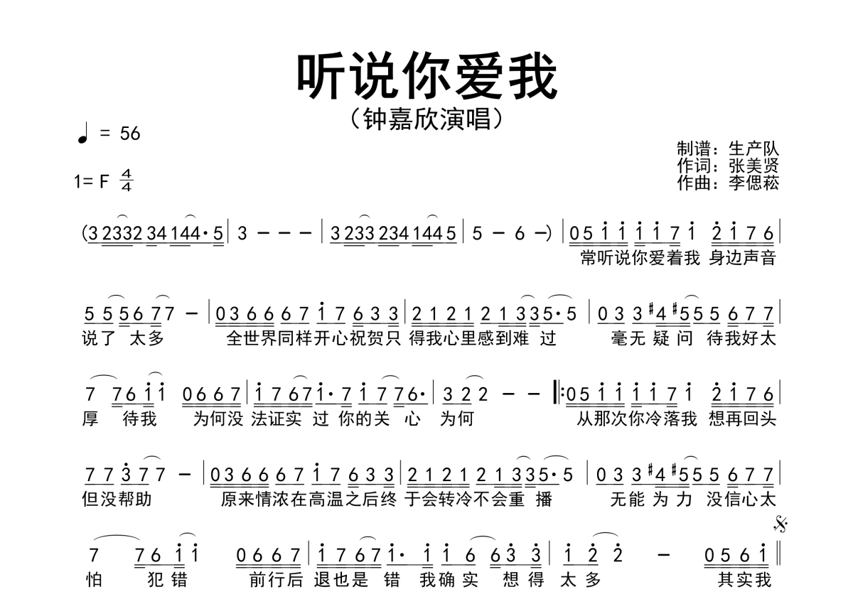 《听说你爱我》是钟嘉欣演唱的一首歌曲,原版简谱,拍号为4/4拍,歌曲速度为每分钟56拍,这份简谱共有一张高清图谱,图谱由 @生产队 编配上传钟嘉欣演唱的经典歌曲《听说你爱我》原版简谱。