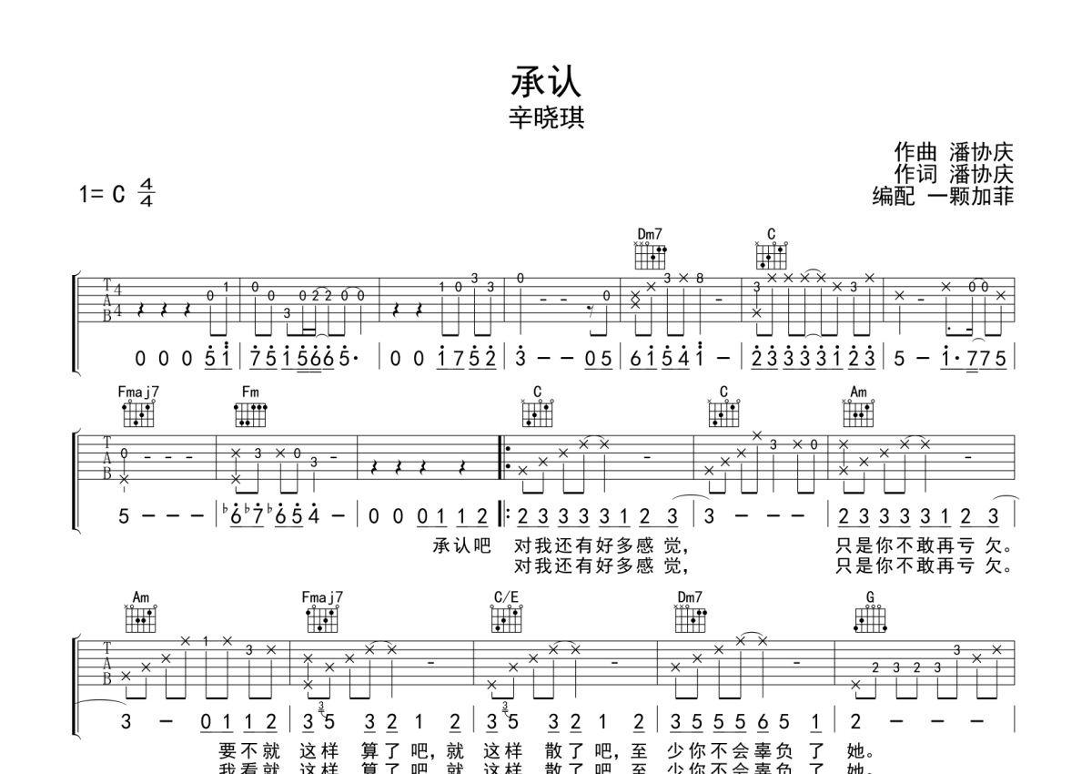 辛晓琪《承认》吉他谱 - C调弹唱六线谱