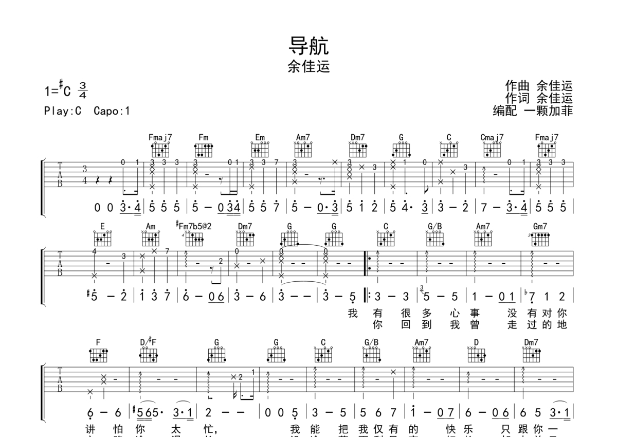 余佳运《导航》吉他谱 - C调弹唱六线谱